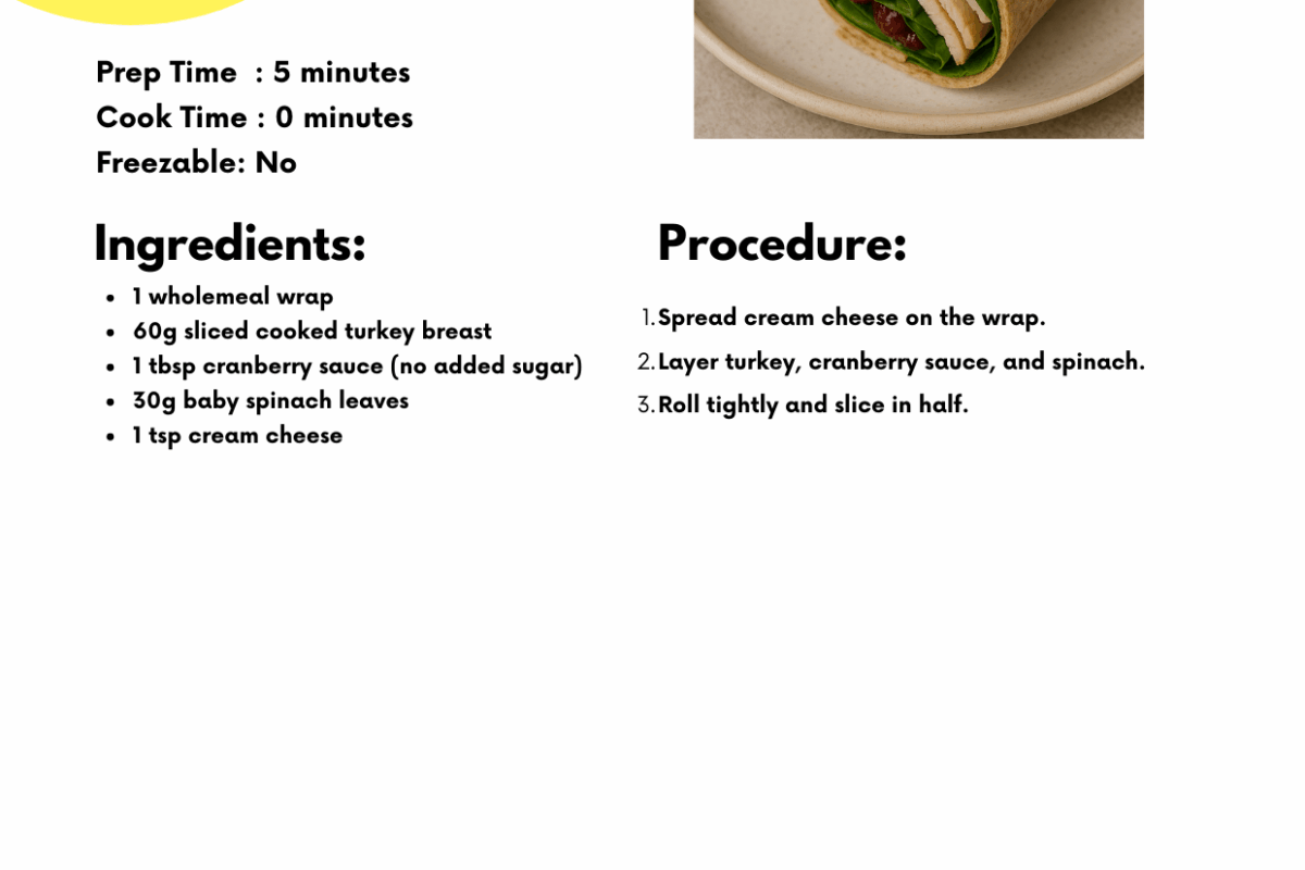 | Lean turkey with fresh spinach and a pop of tangy cranberry — protein, iron and antioxidants wrapped up for a gut-friendly, energising lunch. |